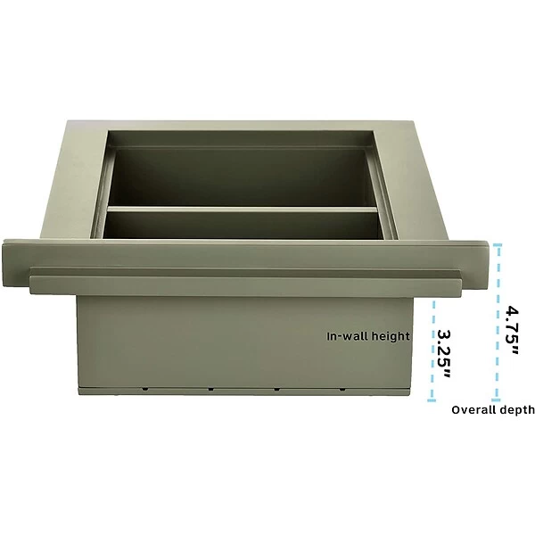 - Has a 3.25 inch in-wall depth to set in the wall and an overall 4.75 inch product depth