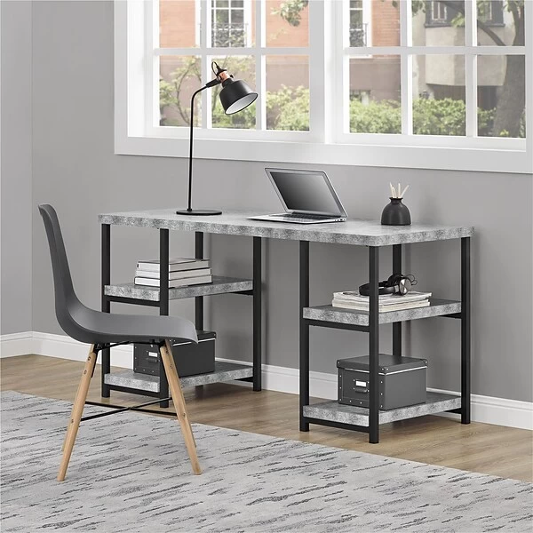 Your home office can now be functional and phenomenal thanks to the multi-functional Ameriwood Home Ashlar Desk. Crafted in the double-pedestal style, this desk boasts a faux-concrete look made from specially laminated paper, making it easy to clean and simple to maneuver. The 4 open shelves are built to hold all your home-office needs, from a printer and scanner to paper, pens, agendas, and more. Just add accessories and make yourself at home. Sturdy black metal legs are made to support and distribute the load, so the Desk is all you need to get your work done. The Desk ships flat to your door and requires assembly upon opening. Two adults are recommended to assemble. Once assembled, the Desk measures to be 29″H x 54″W x 23.5″D.