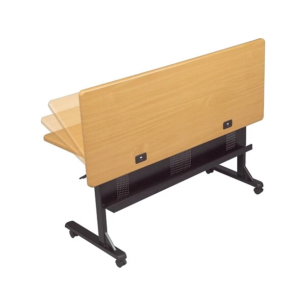 Equip conference rooms or training labs with this flipper table. Its laminate surface top resists damage caused by temperatures and water in case of accidental spills of beverages or experiments, and the cable trough and grommets reduce clutter during equipment demonstrations. This MooreCo rectangular flipper table boasts wheels for enhanced mobility and offers a compact, upright storage position that nests easily with other furnishings.