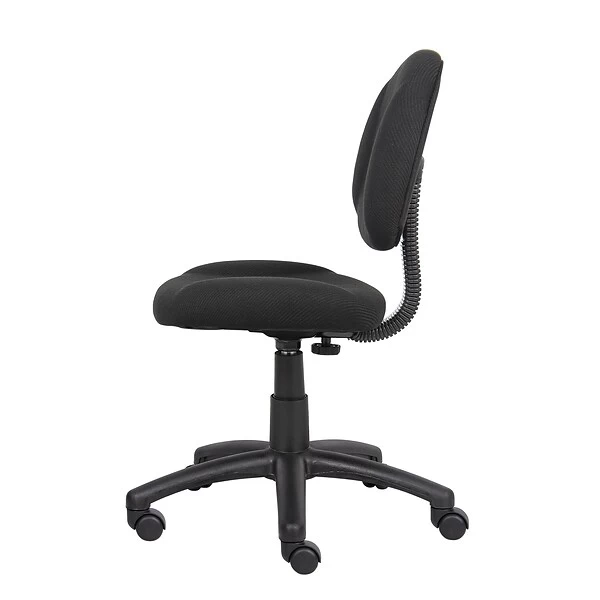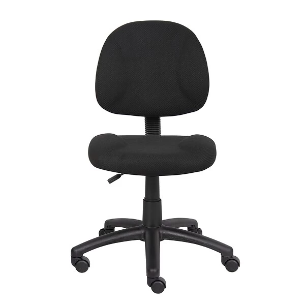With a sturdy nylon five-star base, the Boss black deluxe posture chairwith armless design is built to last. The hooded,dual-wheeled casters make it easy to roll around the office or work space. Fabric upholstery along the seat and back is durable and easy to maintain.