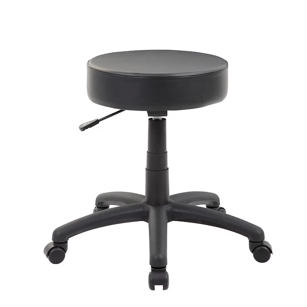 This versatile rolling stool features a vinyl upholstered seat in black that adds an industrial look to any space, whether at home or in the office. With a pneumatic gas lift height adjustment feature, five-star nylon base and hooded dual wheel casters, this sleek, modern stool combines outstanding functionality and mobility. Its strong, sturdy construction accommodates a range of weights of up to 275 pounds.