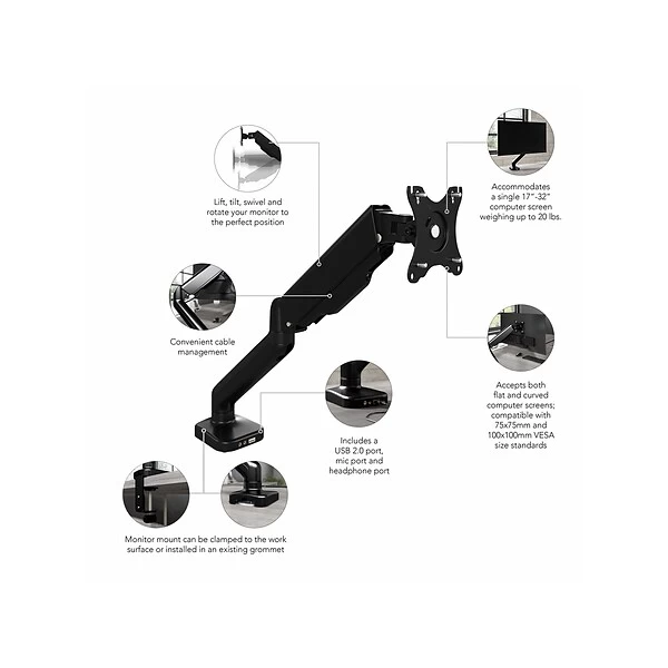 Give your back and neck a break by lifting, tilting, swiveling, and rotating your monitor into the ideal position. Take advantage of the built-in USB 2.0 port, mic port, and headphone port to stay connected while taking on your next project or assignment. This adjustable monitor arm desk mount suits any office environment and is backed by a 1-year warranty.