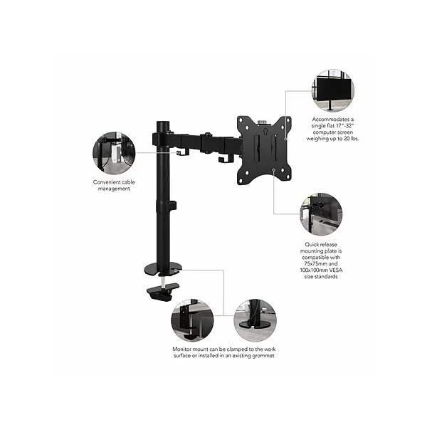 - Accommodates a single 17″-32″ computer screen weighing up to 17 lbs.