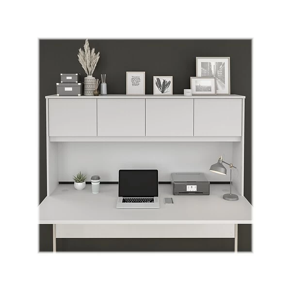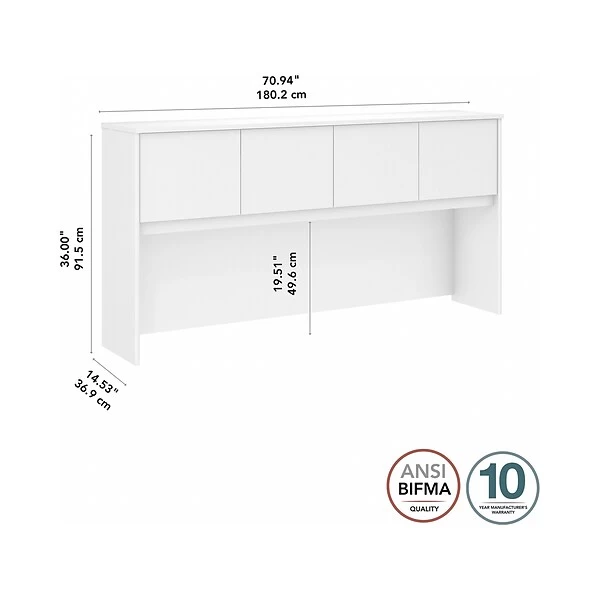 The Bush Business Furniture Hybrid 72″W desk hutch offers a stylish, long-lasting storage solution for the modern professional. Attach the hutch to a coordinating Hybrid collection 72″W computer desk (sold separately) to maintain a neat and orderly workspace. Four cabinet doors conceal books, supplies, equipment, reference materials, and more, so your desktop remains clutter-free. Doors open on smooth Euro-style hinges for an effortless reach to contents. Find the perfect look for your space with five contemporary finish options: black walnut, modern hickory, platinum gray, storm gray, and white. This computer desk hutch has been meticulously tested to meet or exceed ANSI/BIFMA quality standards for safety, durability, and performance and is backed by the Bush Business Furniture 10-year manufacturer warranty. American-made with US and imported parts.