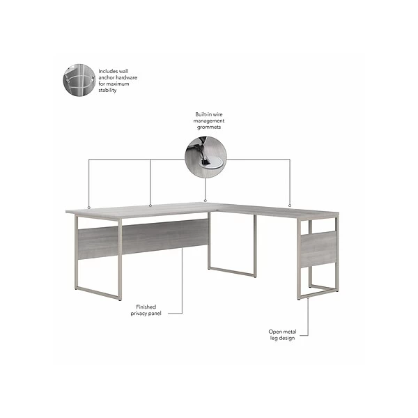 - L-shaped desk features open metal leg design and finished privacy panel, which allows the modern desk to look great facing any direction