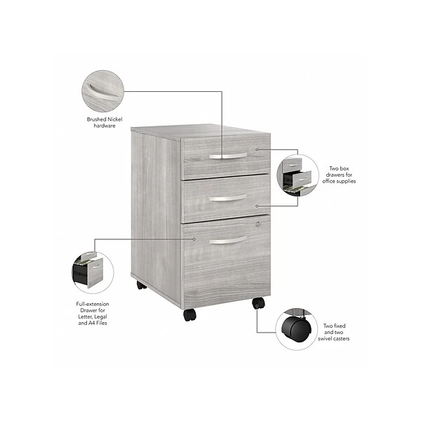 - Rolling file cabinet’s bottom drawer accepts letter-, legal-, and A4-size paperwork, while two box drawers store small office supplies