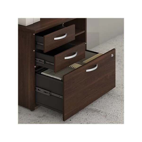 The Bush Business Furniture Studio C office storage cabinet with drawers and shelves offers a stylish, long-lasting workplace organization solution for today’s professionals. Keep important documents, office supplies, work in progress, and equipment in order so you can access the materials you need quickly and easily. A file drawer opens on smooth full-extension ball bearing slides for an effortless reach to letter-, legal-, and A4-size paperwork and can be locked to protect sensitive information. Two box drawers organize writing utensils, notepads, and other supplies, while the open shelves are perfect for frequently used items. This lateral file cabinet with shelves has been meticulously tested to meet or exceed ANSI/BIFMA standards for safety, durability, and performance and is backed by the Bush Business Furniture 10-year manufacturer’s warranty. American-made with US and imported parts.