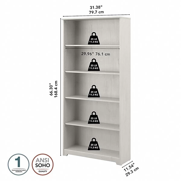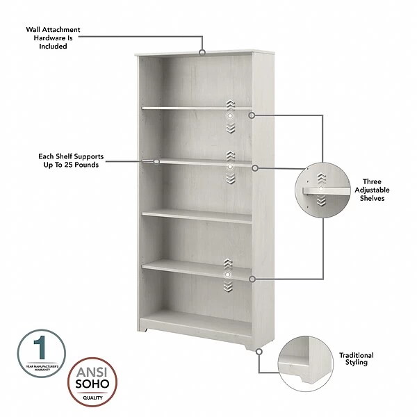 This attractive Bush Furniture Cabot five-shelf bookcase is perfect for the home office, living room, or anywhere practical storage is needed. Its sleek profile and tall design mix style and function at a great value. Use on its own or group a few together for a complete storage wall. The sophisticated, stable design has two fixed shelves for structural strength and three adjustable shelves that move up or down to accommodate items of various sizes. Each shelf supports up to 25 lbs. so you can confidently store a collection of paperback and hardcover books or brighten up the room with your favorite decorations. Wall attachment hardware is included for family-friendly safety and security. This tall bookshelf is tested to meet ANSI/SOHO standards for safety and performance and is backed by a 1-year manufacturer warranty.