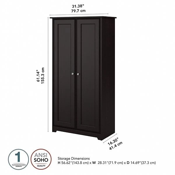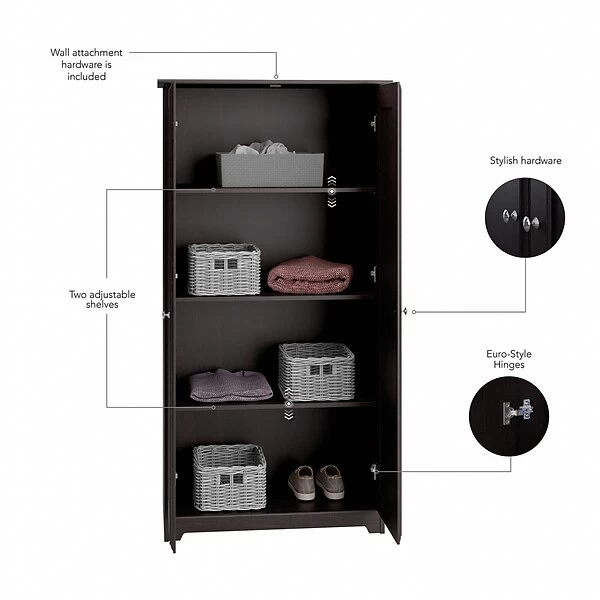 The Bush Furniture Cabot Tall Storage Cabinet with Doors offers a convenient way to keep books, personal items and supplies organized in any home office or living space. Two cabinet doors with smooth Euro-style hinges open to reveal two fixed shelves and two adjustable shelves for the flexibility to store materials of various sizes. Each shelf supports up to 50 pounds, so organizing bulky items like hardcover books, binders and photo albums is no problem. The tall accent cabinet works well as a standalone storage solution or as part of a larger home office furniture set, and it comes with wall attachment hardware for family-friendly safety and security in any environment. This 2 Door Storage Cabinet is tested to meet ANSI/SOHO standards for safety and performance and is backed by the Bush Furniture 1 Year Manufacturer’s Warranty. See the full collection for coordinating items available.