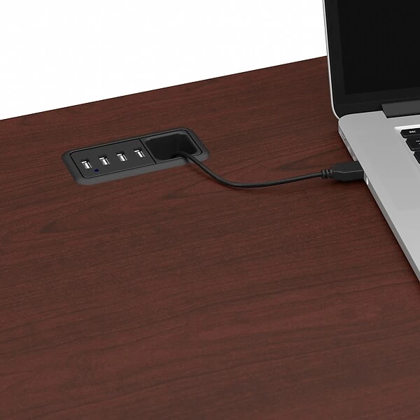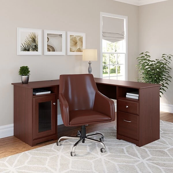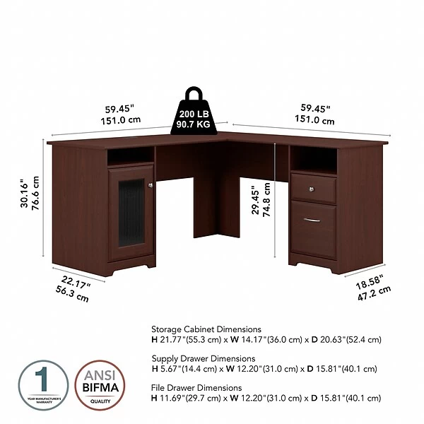 The Bush Furniture Cabot L Shaped Desk offers a spacious and efficient workplace for your home or office. Enjoy a beautiful traditional look with smart features for your convenience. The L Shaped Desk design provides a large durable work surface and just the right amount of storage to keep you feeling neat and organized. Desk storage details include an enclosed cabinet with stylish fluted glass door and a box drawer for supplies. A file drawer glides on smooth full-extension ball bearing slides and accommodates letter, legal or A4 sized paperwork. A built-in 4-port USB hub keeps your devices connected. The unique design saves space but provides you with 60 inches to spread out in either direction. Chrome-finished hardware creates a simple, elegant and timeless appearance. Add the Cabot Hutch (sold separately) to create a complete office set. Backed by a 1 Year Warranty.