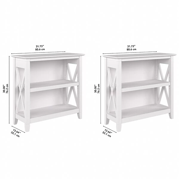 The Bush Furniture Key West small two-shelf bookcase offers a practical storage and display solution that gives your home a touch of casual style. This small bookshelf features a compact, versatile design that makes it a perfect choice for use in a home office, living room, entryway, or virtually any other residential space. One fixed shelf and one adjustable shelf accommodate books, reference materials, and decorations of various sizes. Each shelf supports up to 35 lbs., so you can store and display larger items with confidence. A post leg design and X-pattern accents convey a casual appearance that works well with cottage, coastal, and modern farmhouse style. This small bookcase has been tested to meet ANSI/SOHO quality standards for safety and performance and is backed by a 1-year warranty. See the full collection for coordinating items available.