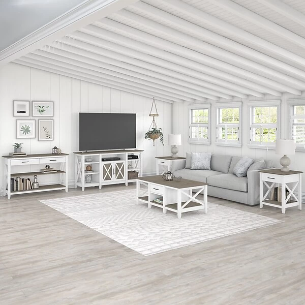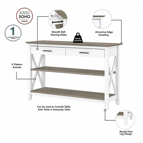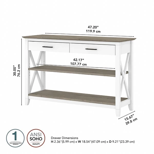 The Bush Furniture Key West console table with drawers and shelves is a perfect way to bring the feel of a coastal retreat to any living space. Stylish X-shaped accents and your choice of casual finishes present a look that works well in homes that embrace farmhouse styling. Box drawers organize household supplies while two shelves offer plenty of room for books, decorations, and more. The bottom shelf is fixed for stability, and the upper shelf can be adjusted to accommodate items of various sizes. The surface is ideal for displaying personal touches like plants, pictures, and other decor. Use the console table on its own, or combine it with coordinating Bush Furniture Key West products for a complete living room furniture set. This console table with storage has been tested to meet Bush Furniture’s standards for safety, performance, and durability and is backed by a 1-year manufacturer warranty.