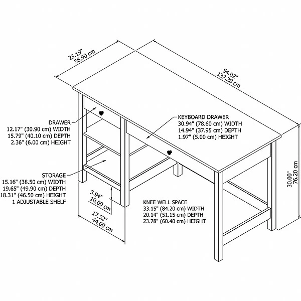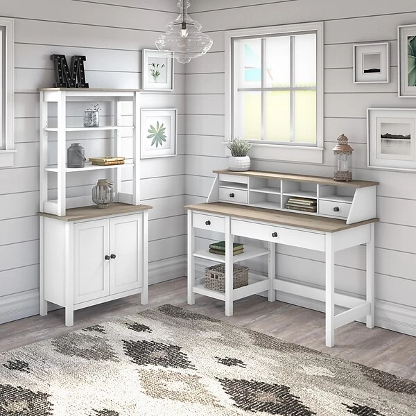 The Bush Furniture Mayfield 54″W computer desk with shelves combines casual looks with a practical design you’ll love when taking on your next project. Stay on top of your daily tasks with a workspace that suits your casual home. Highlighted by its relaxed modern farmhouse style, the Bush Furniture Mayfield 54″W computer desk with shelves also includes plenty of practical features to keep you feeling productive. Spread out on a durable 54″W x 23″D work surface that supports a computer, books and more with a weight capacity of 200 pounds. Two shelves and a small box drawer ensure that the papers and supplies you need are always within reach. The lower shelf is fixed for stability while the upper shelf can be raised or lowered to accommodate items of various sizes. A larger drawer pulls out for easy access to your keyboard or laptop and features a flip-down front that folds up neatly when not in use. This farmhouse desk with storage is tested to meet ANSI/SOHO quality standards for safety and performance and is backed by a 1-year warranty.