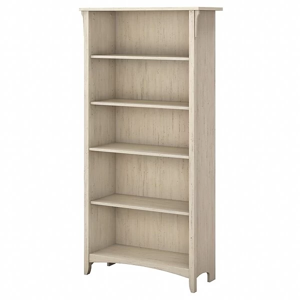 Decorative yet functional, the Bush Furniture Salinas 5 Shelf Bookcase feels comfortable anywhere from a cottage to a family home or apartment. The white Bookcase brings a country flair with a hint of timeless Mission styling into the homes of today as attractive wood accents join appealing tapered legs. Decorative detailing and curved base rails create a casual construction equally fit for a living room, home office, dorm or bedroom. Built with 3 adjustable and 2 fixed shelves, the Bookcase proudly displays your favorite photos and decorations while helping you stay organized. Finished in an on-trend, neutral Antique White with a slightly distressed touch, the casual charm of Salinas will have you feeling relaxed wherever you call home. Backed by a Bush Furniture 1 Year Manufacturer’s Warranty, the 5 Shelf Bookcase meets ANSI/SOHO standards for safety and quality.