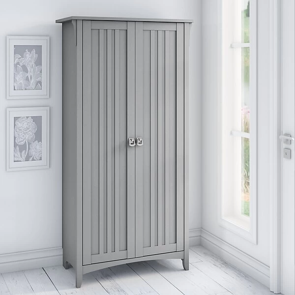 Organize your home with an accent cabinet that combines casual style with a convenient, versatile design. The Bush Furniture Salinas tall storage cabinet with doors features five concealed shelves for keeping miscellaneous household items, office supplies and entertainment essentials in order and out of sight. Three adjustable shelves can be moved up or down to accommodate bulky items like binders and photo albums while the two remaining shelves are fixed for stability.