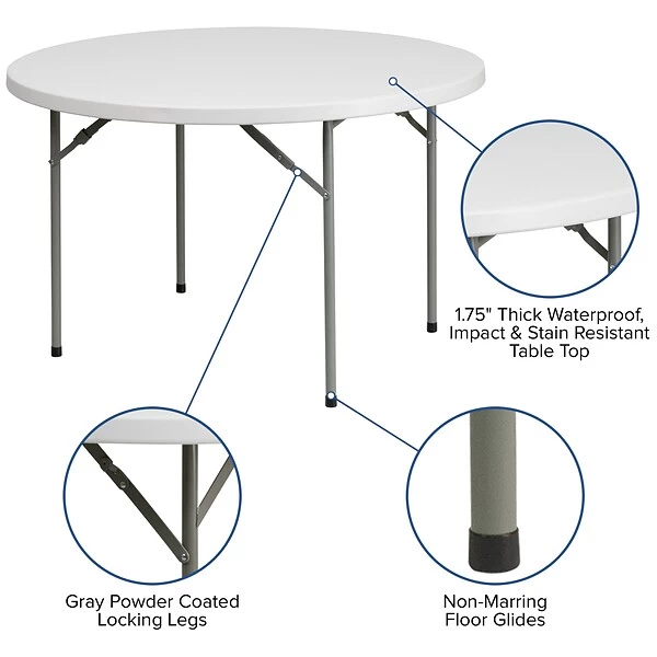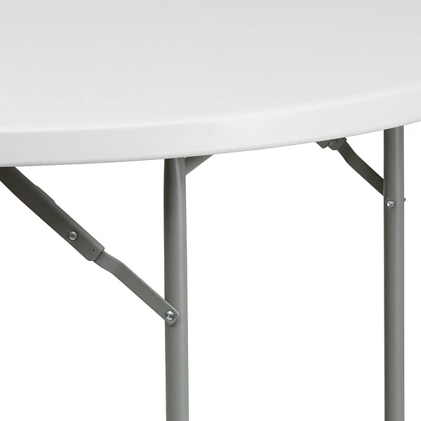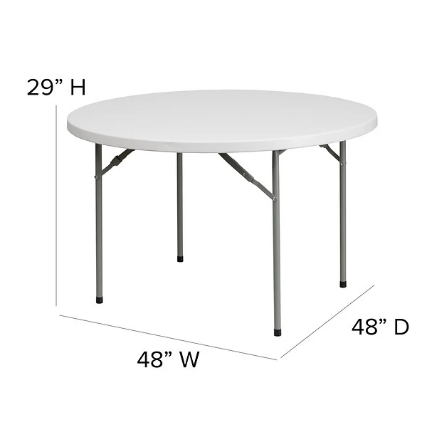 This round folding table is 4 feet long and is beneficial in a multitude of settings that include banquet halls, conference centers, cafeterias, schools and in the home. The table can be used as a temporary seating solution or be setup for everyday use. The durable blow molded top is low maintenance and cleans easily. The table legs fold under the table to make storage more convenient and for better portability. This table is commercial grade to withstand everyday use in the hospitality industry.