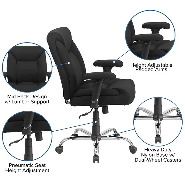 Having the proper desk chair in your workspace can provide you with significant health benefits and Big & Tall office chairs are designed to accommodate larger and taller body types. This chair has been tested to hold a capacity of up to 400 lbs., offering a broader seat and back width. A mid-back office chair offers support to the mid-to-upper back region. This office chair features plenty of thick, plush padding to provide greater support. The waterfall front seat edge removes pressure from the lower legs and improves circulation. Chair easily swivels 360 degrees to get the maximum use of your workspace without strain. The pneumatic adjustment lever allows you to easily adjust the seat to your desired height. The adjustable armrests take the pressure off the shoulders and the neck, which minimizes the risk of pain. The chrome base adds a stylish look to compliment a contemporary office space.