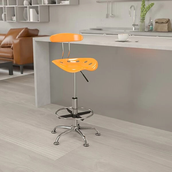 - The Flash Furniture vibrant orange armless drafting stool utilizes high-density polymer to ensure prolonged durability