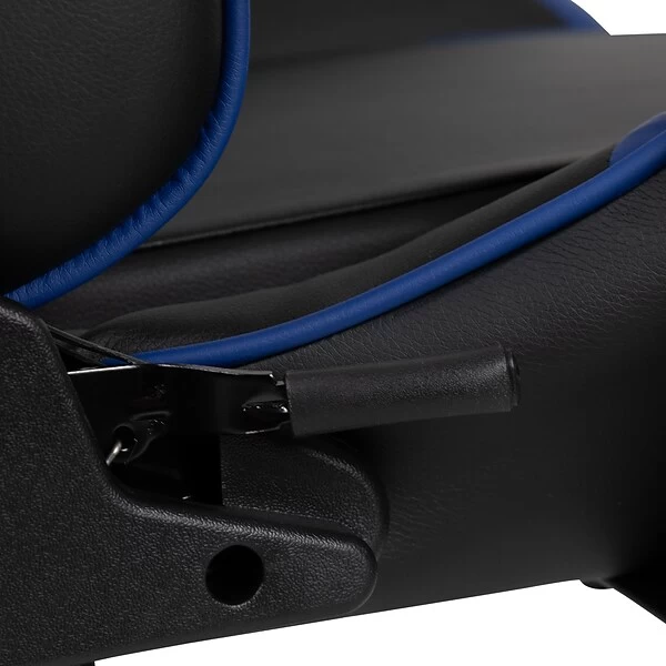 Have game day any time on your PC or with your console of choice with this blue racing gaming chair. Featuring a reclining back and slide-out footrest covered in soft and durable LeatherSoft upholstery, this high back ergonomic office chair is a must have. Adjustable headrest and lumbar pillows can be repositioned where you need them or removed. Adjustable pivot arms relieve pressure from your neck and shoulders. Slide the extended footrest out by pulling the loop then flipping the footrest up to properly elevate your feet. A separate lever reclines the back 87° ~ 145° while the lever underneath the seat controls the seat height and locks the chair in an upright position. This faux leather gaming chair cleans up easily with a solvent and water based cleaner such as foam. Complete your gaming experience with our black gaming desk with cup holder, headphone hook, and monitor/smartphone stand.