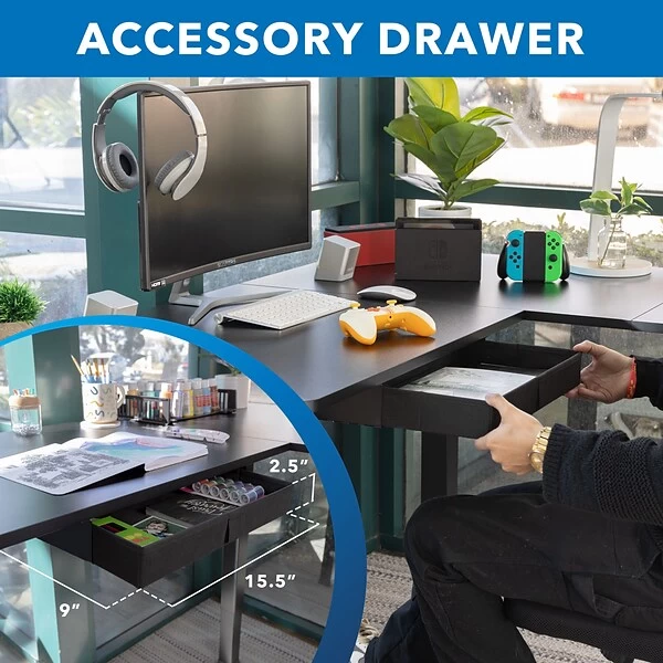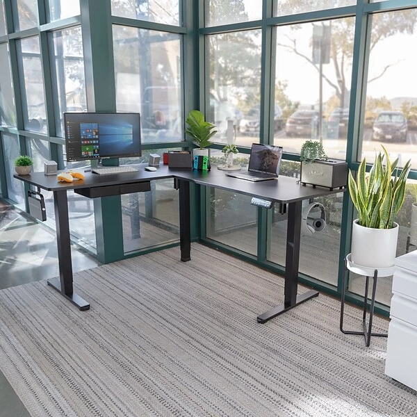 Switch between sitting and standing at the simple push of a button. The advanced LED control panel comes with three memory settings for your preferred sitting and standing heights. The integrated anti-collision function ensures that your desk does not bump into objects such as filing cabinets when it is lowered. To help you stay organized, the corner desk features a cloth drawer, two hooks for bags or headphones and cable management for neat cable routing. Two motors ensure smooth and quiet height adjustment between 28.3 and 46.5 inches. To provide you with utmost flexibility when it comes to choosing the best space for your corner desk, the longer desktop piece can be installed on either the left or the right side.