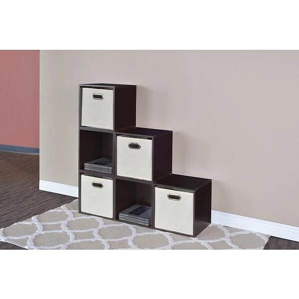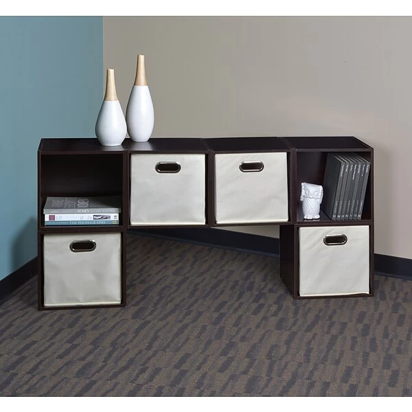 Let your creativity run wild with Cubo! This innovative set of 6 storage cubes by Niche are designed to fasten together in any direction! Connect them in any way you like. In a row, in a pyramid, in a U or L shape or countless other configurations. Start small and add on later. Cubes connect to one another with spring pins, making it easy to customize and create a storage system just for you with a single cube to a set of 12 or more. Niche storage cubes are actually cubes! With interior dimensions of 12 1/8″ x 12 1/8″ x 12 1/8″, they can be used in any direction. There’s no “right” way to use them because all sides measure the same! Who ever said all cubes had to face the front like a bookcase? Cubo storage cubes can attach together in any direction, which opens up a myriad of new design possibilities. Turn one to the right, turn another to the left. Keep one facing front and still another facing the back. Perfect to clean up clutter in closets, entryways, laundry & storage rooms, as a bookcase, nightstand or media storage, in a classroom or children’s room-these cubes fit anywhere! Its rich dark Truffle finish shows subtle wood grain and is sure to please and coordinates with the rest of the Niche line. No tools LockDowel assembly allows pieces to simply snap together and lock into place for a sturdy, hassle-free build in less than 2 minutes. No more searching for the right size screwdriver or dropping tiny screws. Just snap into place and go. Less hardware and fewer small parts means less plastic packaging and less waste. Add on, arrange and rearrange Niche Foldable Fabric Bins for a fresh, new custom look whenever you like!