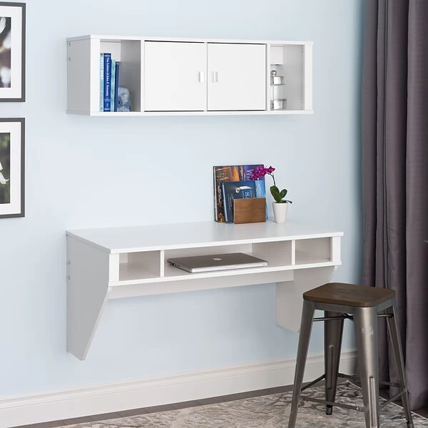 Prepac™ Designer floating hutch in white supports a concealed behind doors along with side compartments that makes it easy to organize and store essentials. Hutch has an approximate weight of 60 lbs and has dimensions of 42.5″W x 13″H x 12″D.