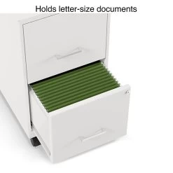 - Two-drawer filing cabinet holds letter or legal size documents