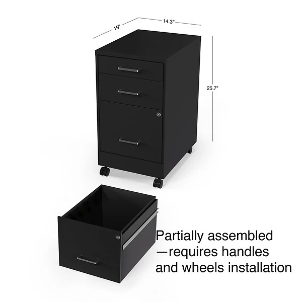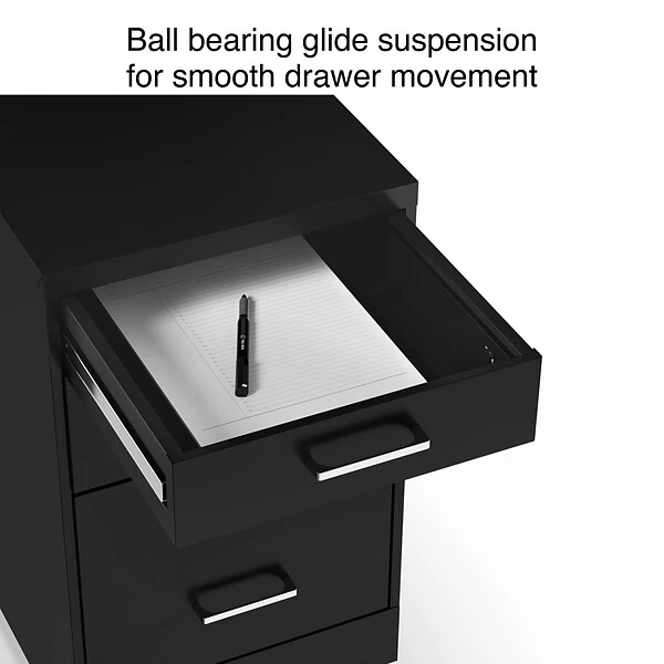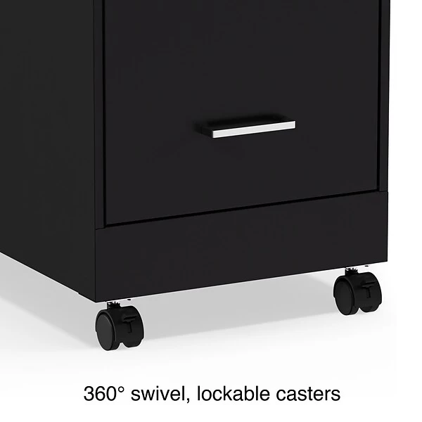 Organize your home or professional workspace with this 3-Drawer vertical mobile file cabinet. Keep all your letter-sized documents secure and tucked away in two 19” depth drawers. This file cabinet comes equipped with one factory installed lock and key, controlling the bottom two drawers for peace of mind and security. The clean black finish and polished handles keep your office space looking contemporary and organized. This cabinet is Backed by a 7-year limited warranty, keeping you satisfied for years to come.