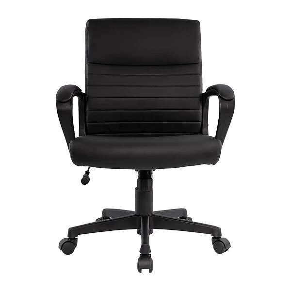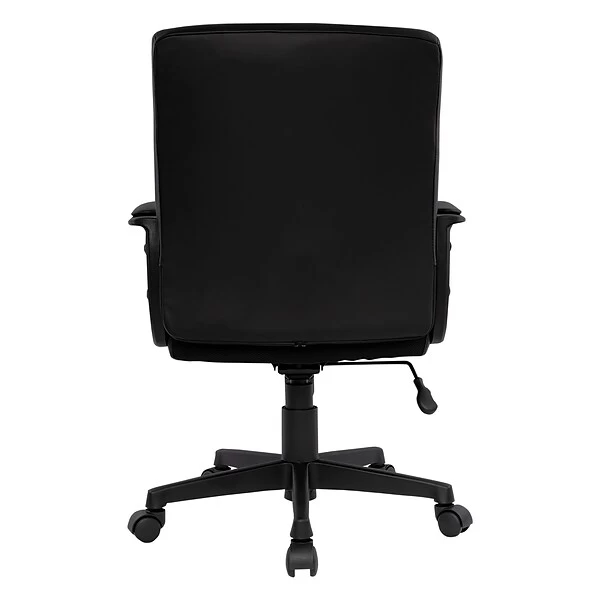 Stay comfortable while you work in this Tervina™ black managers chair. Padded armrests provide added comfort, and built-in lumbar offers additional support. The soft upholstery looks and feels just like real leather for an elegant finishing touch. Use the pneumatic seat height adjustment and tilt tension to find then lock the perfect setup for your body.