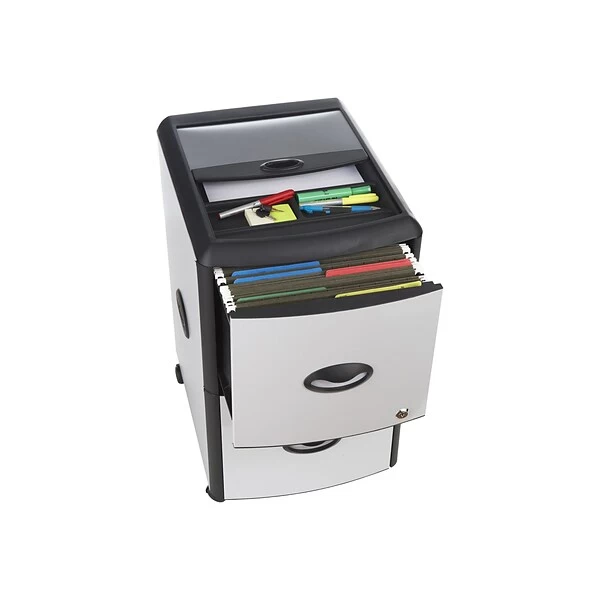 Expand your desk setup with this mobile file cabinet. Two spacious drawers offer storage for letter-size file folders, keeping important paperwork within arm’s reach. The handy organizer top provides a place to stash pens, pencils and other small accessories, while the rolling casters ensure easy movement. This Storex file cabinet locks to provide added security for the contents within.