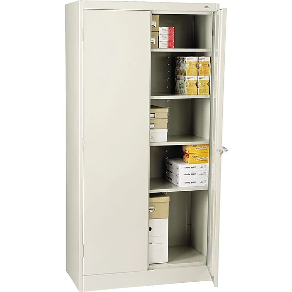 Tennsco Standard storage cabinet in light gray color has 4 adjustable wide shelves to accommodate different items. Cabinet measuring 72″ x 36″ x 18″ with single handle features built-in shelf support tabs and 3 point locking system.