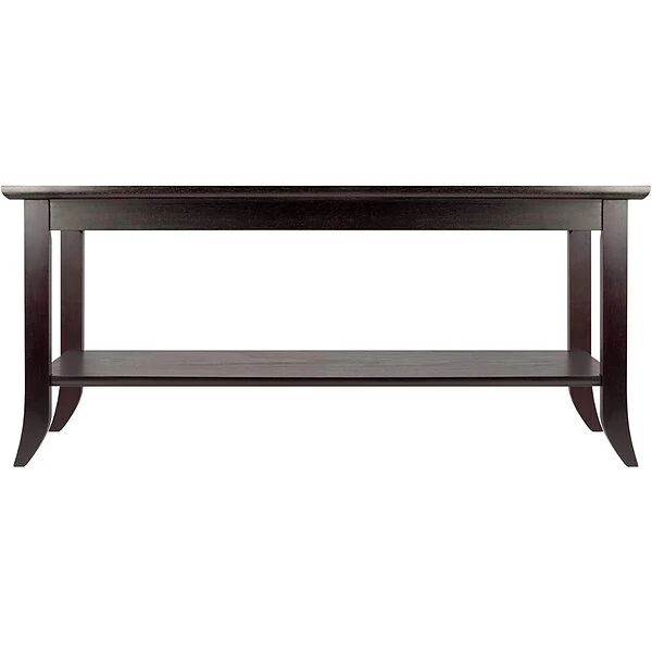 Winsome Genoa rectangular coffee table features a shelf for convenient storage.Frame and the shelf are dark espresso finished with a tempered glass top to offer an elegant look to suit any of your existing decor.