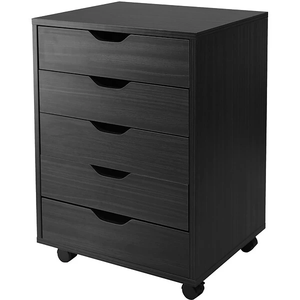 Made with composite wood with a black finish, this Winsome Halifax cabinet is durable. Use the five drawers to store small items, and place decorative items on the top for style. Each drawer is wide and provides plenty of room for storing accessories an d stationery supplies. This cabinet includes optional locking casters, so you can easily move this storage cabinet around the office.